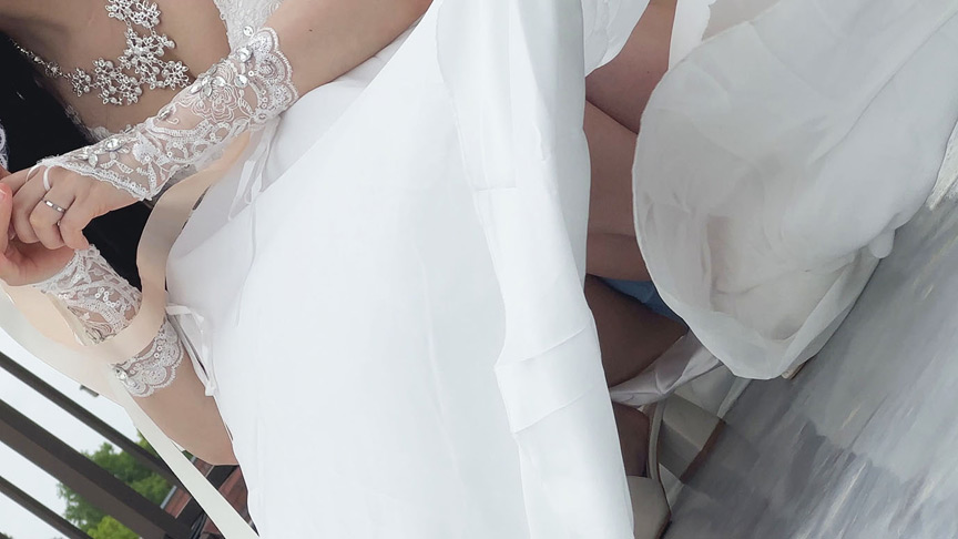 幸せいっぱいの新婚夫婦。永遠の愛を誓い合った花嫁姿。一生の宝物にとウエディングドレス姿で記念のアルバム撮影。幸せ絶頂の夫婦をドン底にwさあ、旦那の横で代わりに新婚初夜を奪いましょう!!
